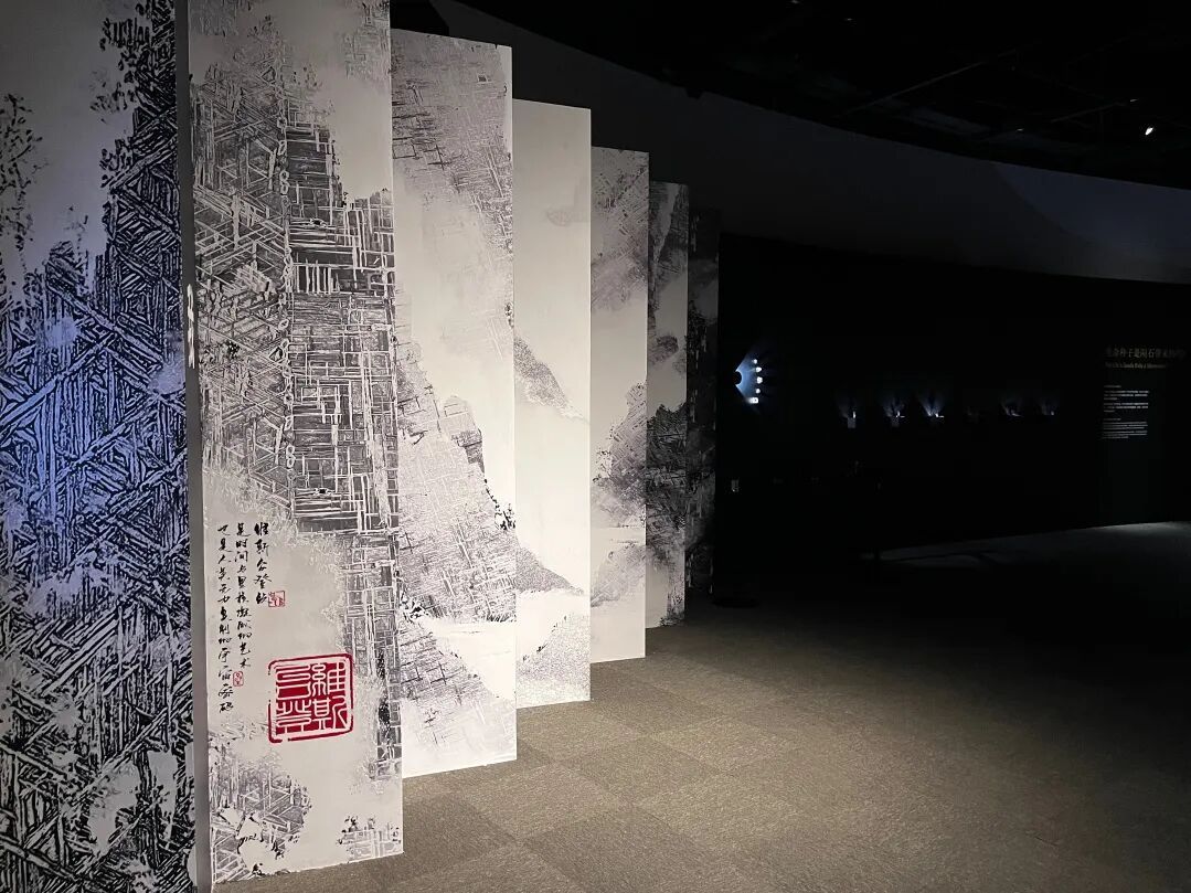 这面陨铁纹路山水画折叠墙,正是果壳设计总监白云飞的创意。事实上,这是他搜集了10种不同形态类型的维斯台登纹之后,亲手设计拼接制作而成。观众可以亲手抚摸这面墙,用指尖感受上面源自陨石肌理的凹凸起伏,更直观也更鲜活地认知这来自天外的纹路。