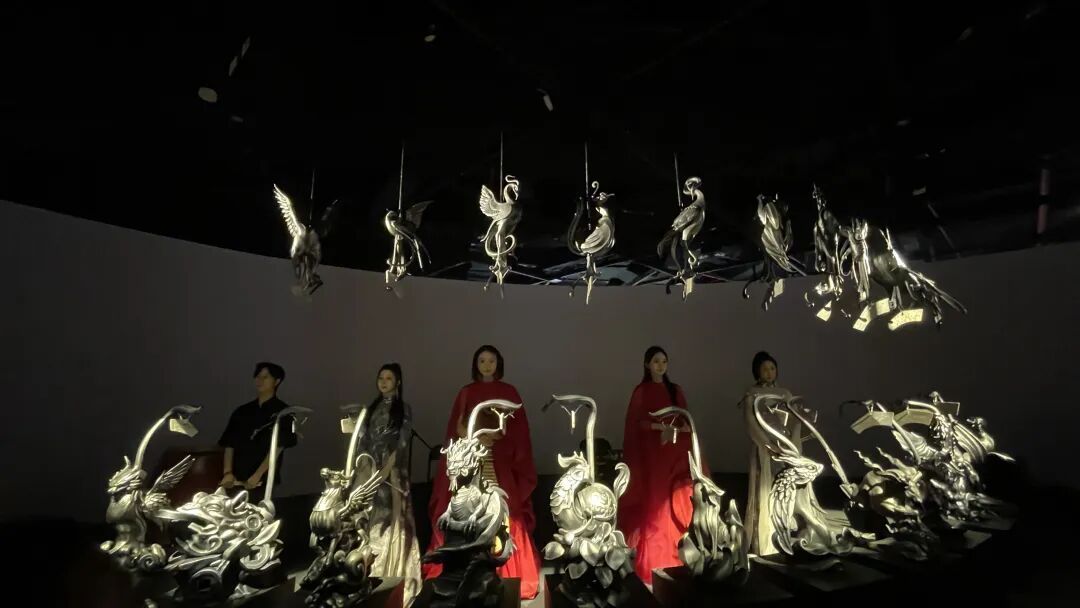 现在,在上海天文馆“大器星成”的特展现场,你可以看见这组耗时五年最终制作成功的陨铁编磬。20片磬片架设在20个原创设计的主要以《山海经》上古神兽身上,以四季、七政、九天的阵型排布。演奏时不需人工,神兽雕塑内部嵌入的机器人部件会按照编写好的程度依次敲击磬片。这是真正的天籁之音,是地外物质被人类文明塑造后发出的嗡鸣。因此,这套编磬的名字,叫作“万籁寂”。