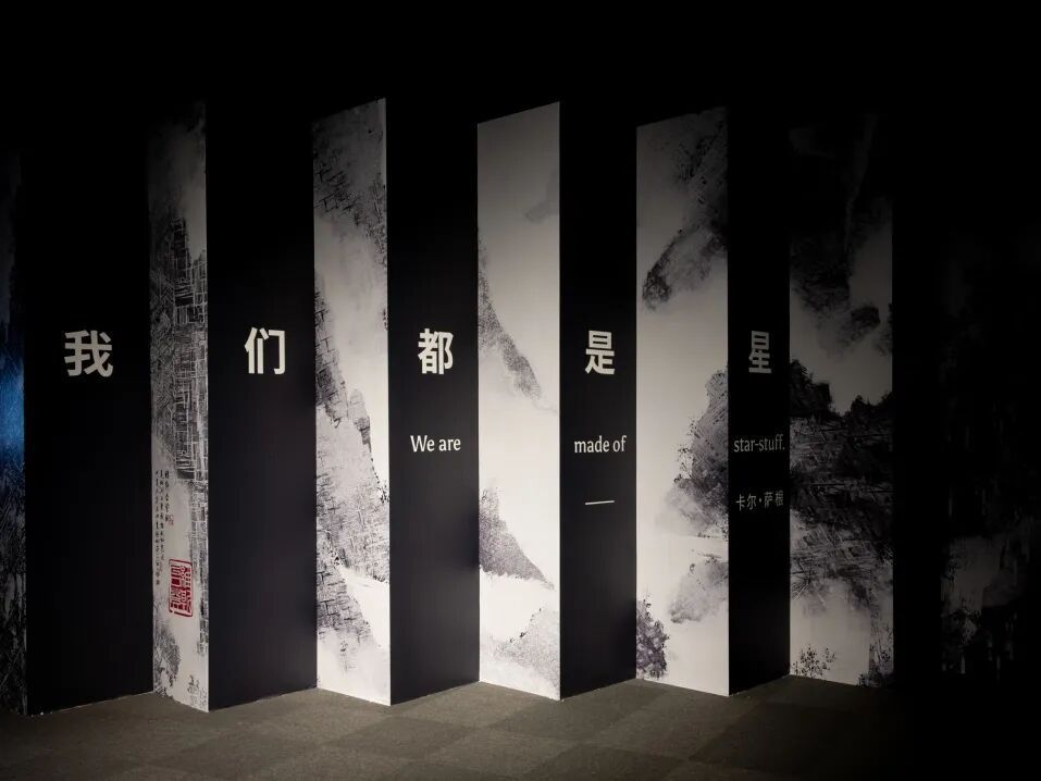“除去‘万籁寂’,我个人最喜欢的一件展品是维斯台登纹拼接的中国山水画折叠墙。”上海科技馆天文研究中心陨石研究室主任杜芝茂介绍到:“这个展品正面是山水画,看完了转过来,背面是卡尔萨根的名言‘我们都是星尘’。大家走到这个位置看完后,认知会上升到哲学的高度。”
