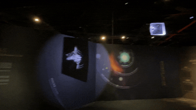展馆内另外一件别具巧思的展品,来自央美实验艺术与科技艺术学院李博老师之手。一望之下,这似乎只是一片形状有点奇怪的玻璃片,悬挂在射灯的光圈里,不断地来回旋转。观察它对面的投影墙,我们会惊喜地发现,有一个由光影构成的袖珍太阳系,正不断在凝聚成形和化为星云之中轮回——这是早期太阳系的演化过程,也是陨石和地球形成时的遥远印象。